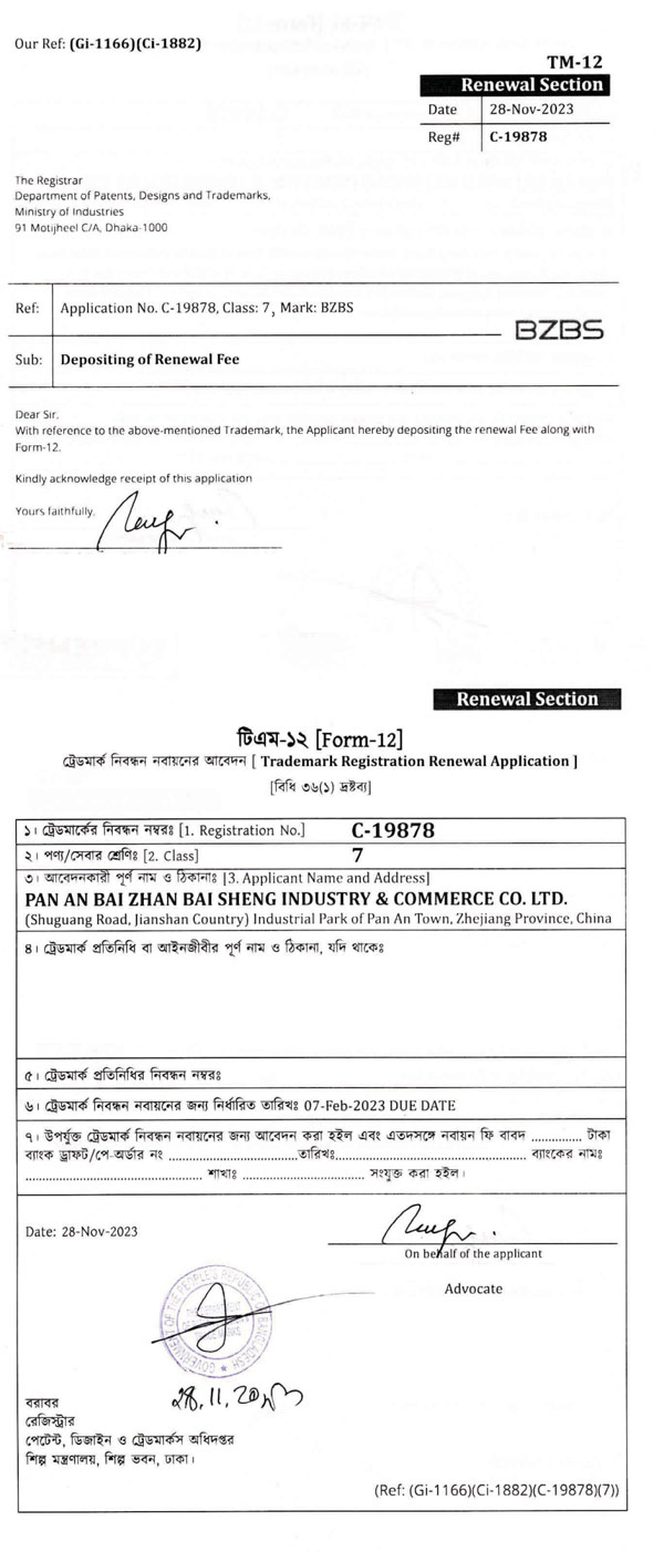 BZBS C-19878 孟加拉 续展回执